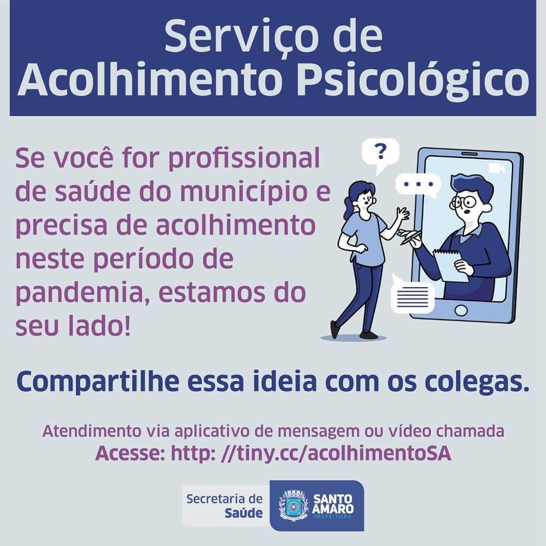 A Prefeitura de Santo Amaro disponibilizou um canal para atendimento psicológico nesse período de quarentena aos profissionais municipais de saúde. A ação tem o objetivo de prestar apoio nesse momento de sofrimento psíquico, em que esses profissionais são tão exigidos. O atendimento preza pela acolhida de forma sigilosa, mediando sempre o melhor dia e horário para ouvi-los, via mensagens ou chamada de vídeo. Acesse: http://tiny.cc/acolhimentoSA.