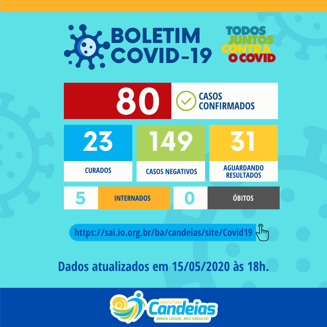A prefeitura por meio da Vigilância Epidemiológica – Viep, informa o boletim da evolução do Coronavírus. Aumentou para 80, o número de pessoas acometidas pela Covid-19. Desses, 7 casos são de residentes de outras cidades que foram testados em Candeias. O novo layout do nosso boletim Covid-19 leva em consideração a atualização da Nota Técnica nº 54 do COES SESAB, quando testes rápidos positivos passam a ser aceitos para notificação da Covid-19. Dessa forma, não será mais necessário detalhar se o critério de confirmação foi laboratorial, clínico epidemiológico ou testagem rápida.