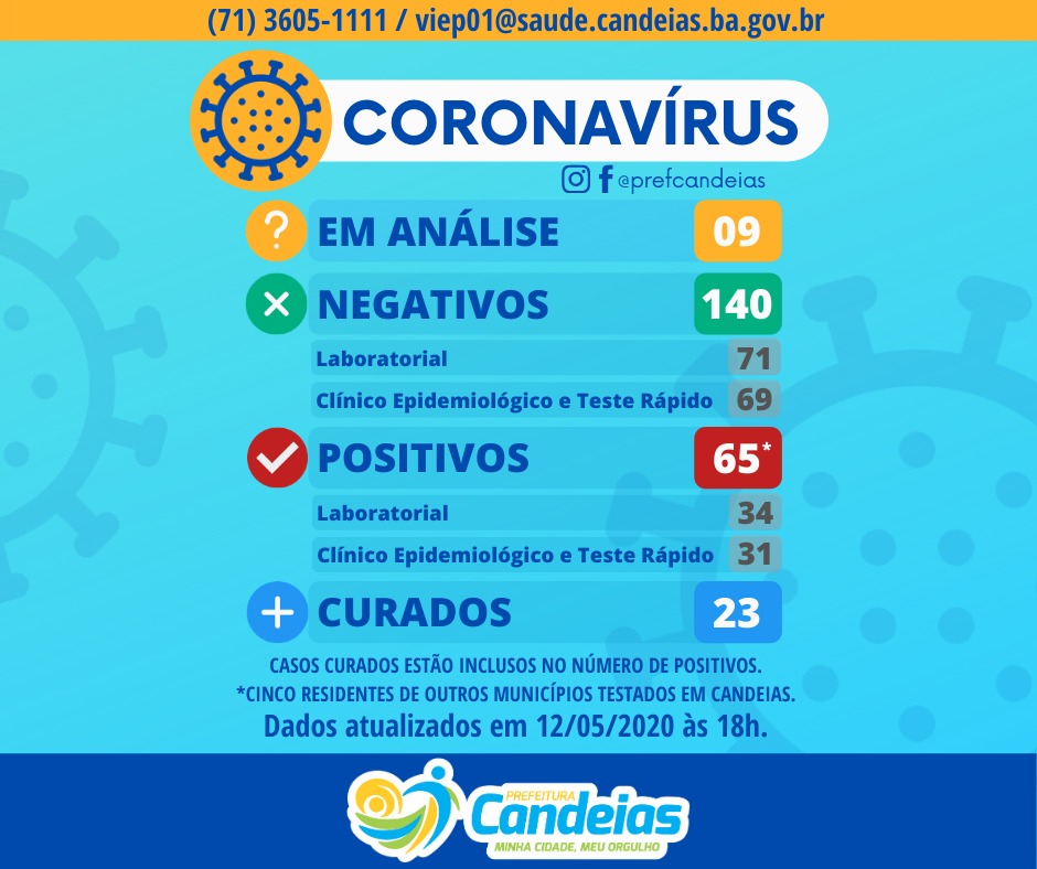 Dos casos confirmados, 05 são de pacientes de outros municípios, mas que fizeram o teste em Candeias. Dos pacientes confirmados na data de hoje está incluso o prefeito da cidade Drº Pitágoras que foi testado positivo e encontra-se bem, em isolamento social