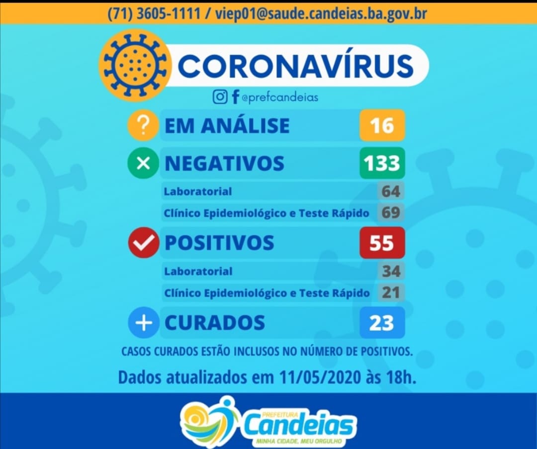 Os números de infectados na cidade de Candeias não param de subir e, em larga escala. No boletim desta segunda-feira (11), já aponta 51 pessoas infectadas pela covid-19 e ainda conta com 16 exames de pacientes que estão em analise.