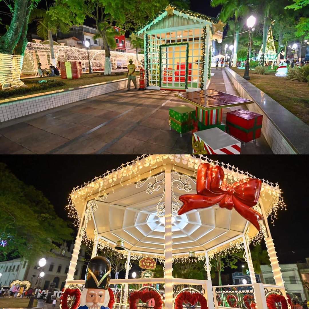 A Casa do Papai e Mamãe Noel, anjos e árvores iluminadas, assim como o imponente coração encantado, são elementos que tambem compõem a decoração natalina na Praça da Purificação.