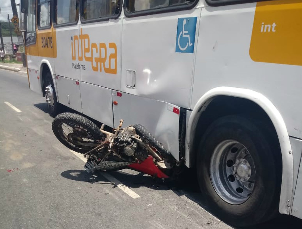 Um homem escapou ileso após a moto que ele pilotava ficar completamente destruída em uma batida com um ônibus, ocorrida na manhã desta terça-feira (12), em Salvador. A moto foi parar embaixo do coletivo.