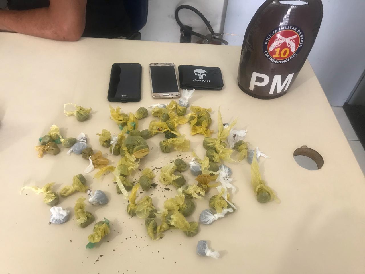 De acordo com policiais do 3º Pelotão da 10ª Companhia Independente da Polícia Militar (CIPM), durante abordagem de rotina foi encontrado com os suspeitos, um saco plástico contendo 54 trouxinhas de Maconha pronta para comercialização, uma outra trouxa com maior quantidade da mesma droga, além de 2 celulares.