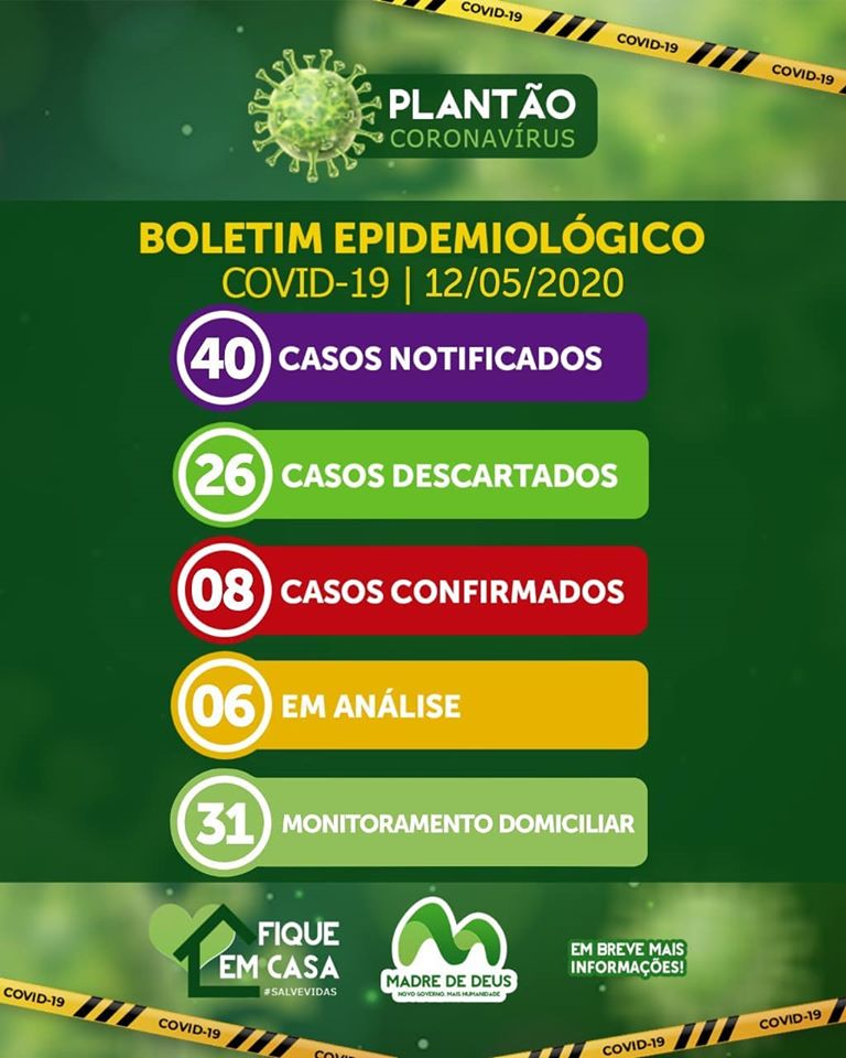 Madre de Deus registrou na noite desta terça-feira (12), mais 3 casos de coronavirus na cidade. Agora o município totaliza 8 casos, tendo 6 em análise, 31 em monitoramento domiciliar e 26 descartados.