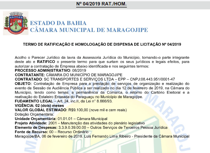 O presidente da Câmara Municipal de Maragojipe, Luis Fernando Lima Ribeiro (Luisinho) PP, realizou nessa terça-feira (12) uma audiência Pública na cidade onde gastou um montante de R$ 9.100,00 (nove mil e cem reais). A informação foi confirmada na publicação do diário oficial do município da última segunda-feira (11). A audiência que tinha como objetivo debater temas importantes como a permanência da comarca, o retorno do cartório eleitoral e a reativação do Estaleiro Enseado do Paraguaçu, contou com a presença da prefeita e esposa do presidente, Vera Lúcia (PR), vereadores, o comandante da PM Major Marcos Davi, secretários e a população. Na publicação do DO o pagamento da dispensa de Licitação de Nº 042019 foi para a empresa, SC Transportes e Serviços, que foi contratada para realizar os serviços de organização e buffet da audiência pública. Entramos em contato com o presidente Luis Fernando e sua assessoria, no entanto, não retornaram até o fechamento da matéria.