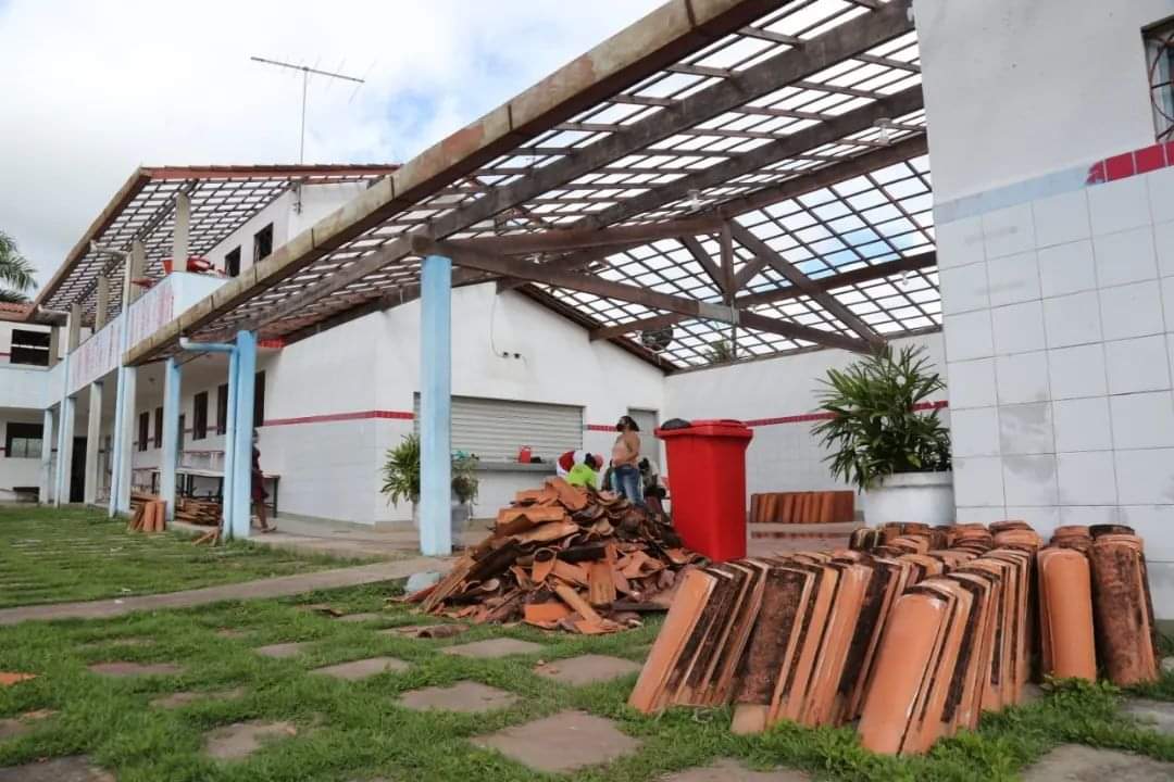 Por aqui, a escola está passando por toda uma revisão elétrica, com trocas de fiação estragada, de lâmpadas e tomadas. Retelhamento com 30% de telhas novas e substituição de madeiras deterioradas. Além disso, também teremos pintura geral, colocação de forro, revisão hidráulica e recomposição dos sanitários (torneiras, descargas, tampas de vaso, cubas de pia, etc.),