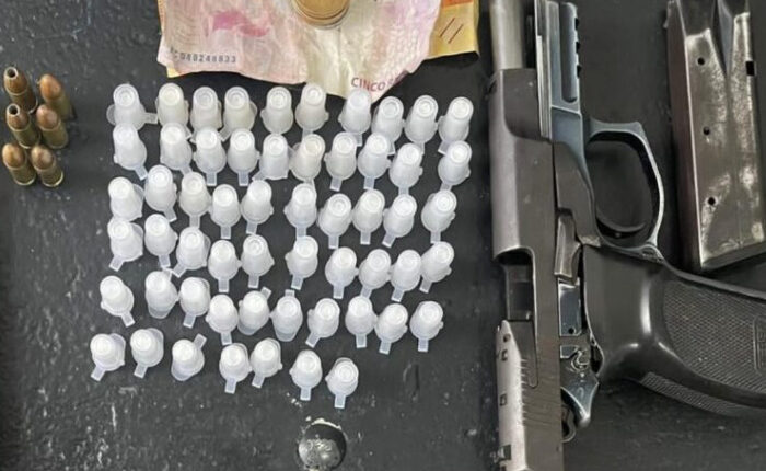 Com o foragido foram apreendidos uma pistola calibre 9mm, carregador, munições, 57 pinos de cocaína, celular e 27 reais.