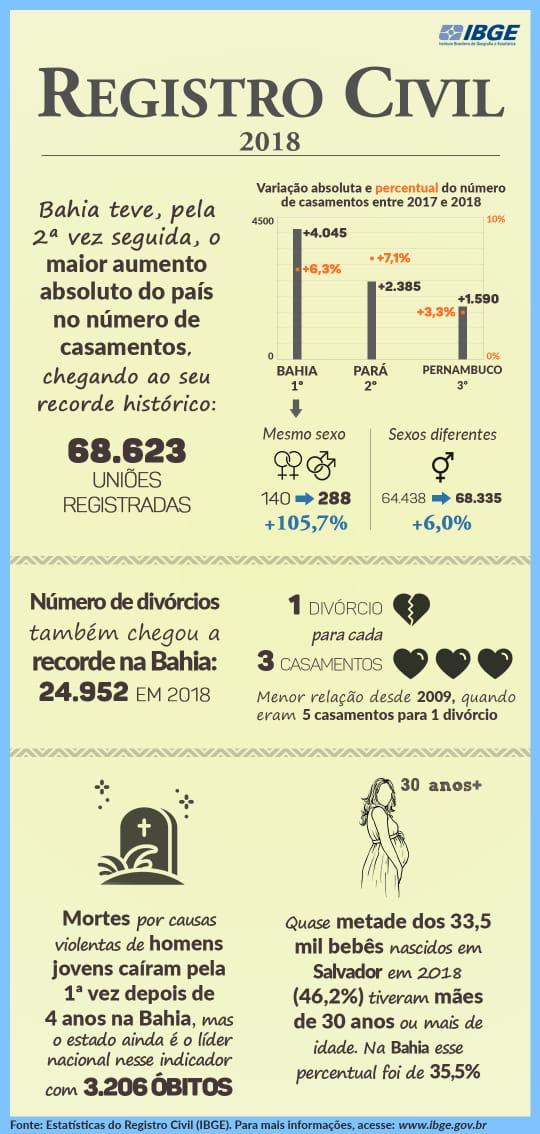 Ainda segundo o IBGE, a Bahia teve, pela 2ª vez seguida, o maior aumento absoluto do país no número de casamentos (de sexos diferentes), chegando ao seu recorde histórico: 68.623 uniões registradas. Houve acréscimo, também, nas uniões do mesmo sexo: de 140 para 288. Ou seja, 105,7%. Ironicamente, o número de divórcios também chegou a recorde na Bahia: 24.952 em 2018.