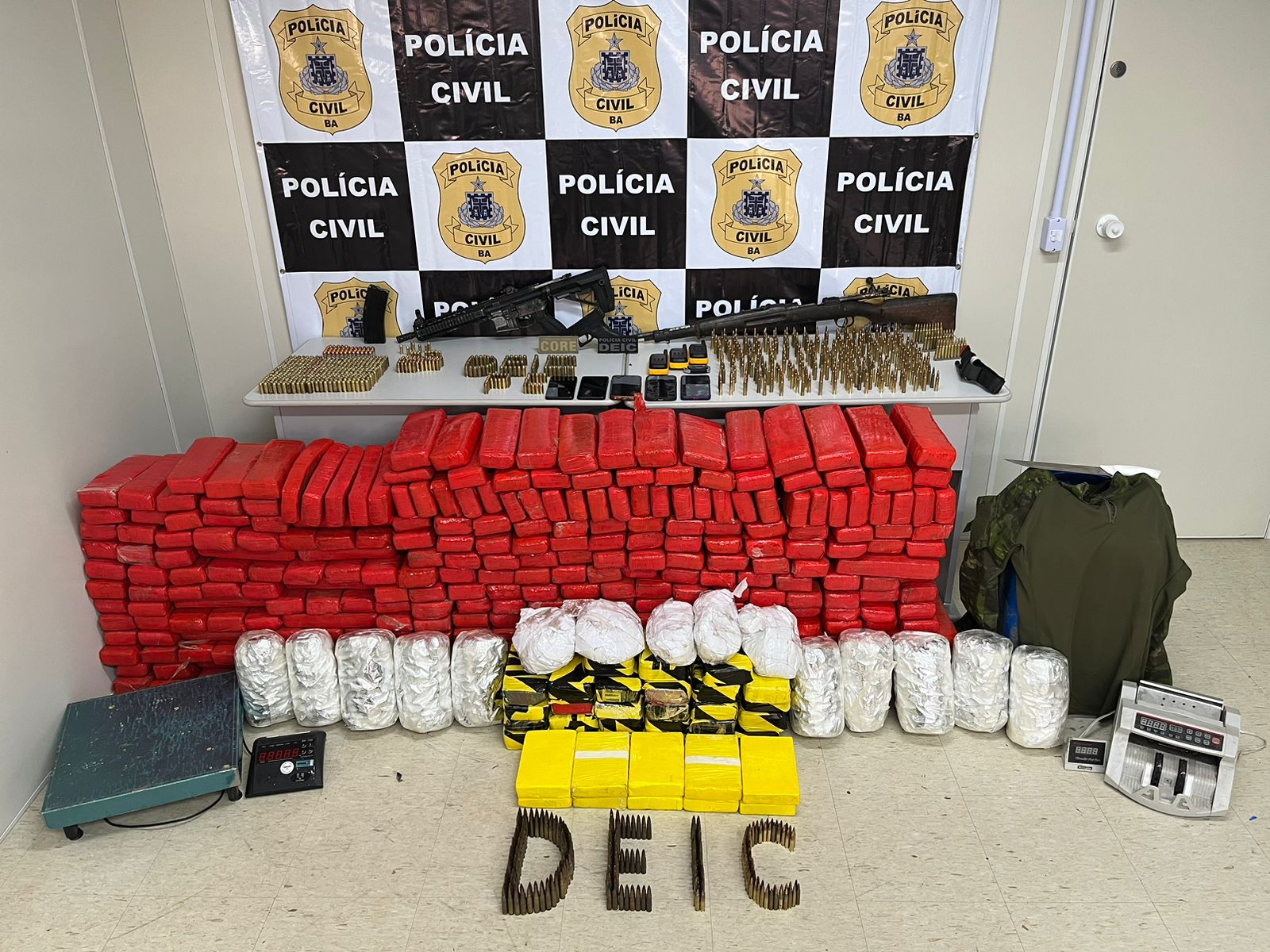 A Polícia Civil da Bahia, por meio do Departamento Especializado de Investigações Criminais (Deic), desarticulou, no município de Candeias, nesta segunda-feira (23), um bunker e apreendeu aproximadamente meia tonelada de drogas, entre maconha, crack e cocaína, dois fuzis calibres 5.56 e 7.62 e milhares de munições. Todo material foi apreendido dentro de um imóvel que pertence a um dos fugitivos do sistema prisional, responsável pelo tráfico de drogas naquela região e também um dos líderes de um grupo criminoso.