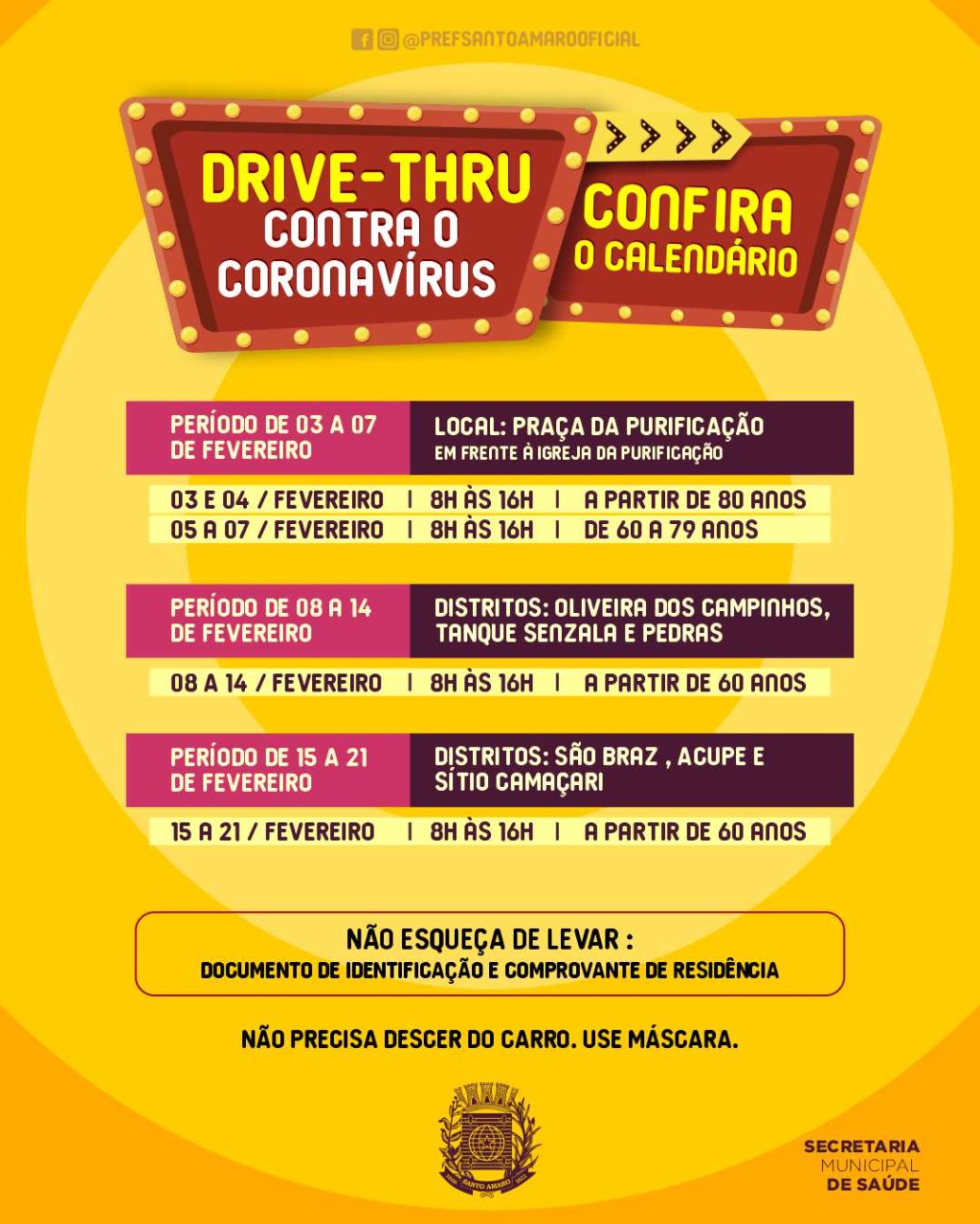 Para acelerar o processo de vacinação contra a covid-19, em Santo Amaro, a Prefeitura, através da Secretaria Muncipal de Saúde, vai implantar o formato drive-thru.