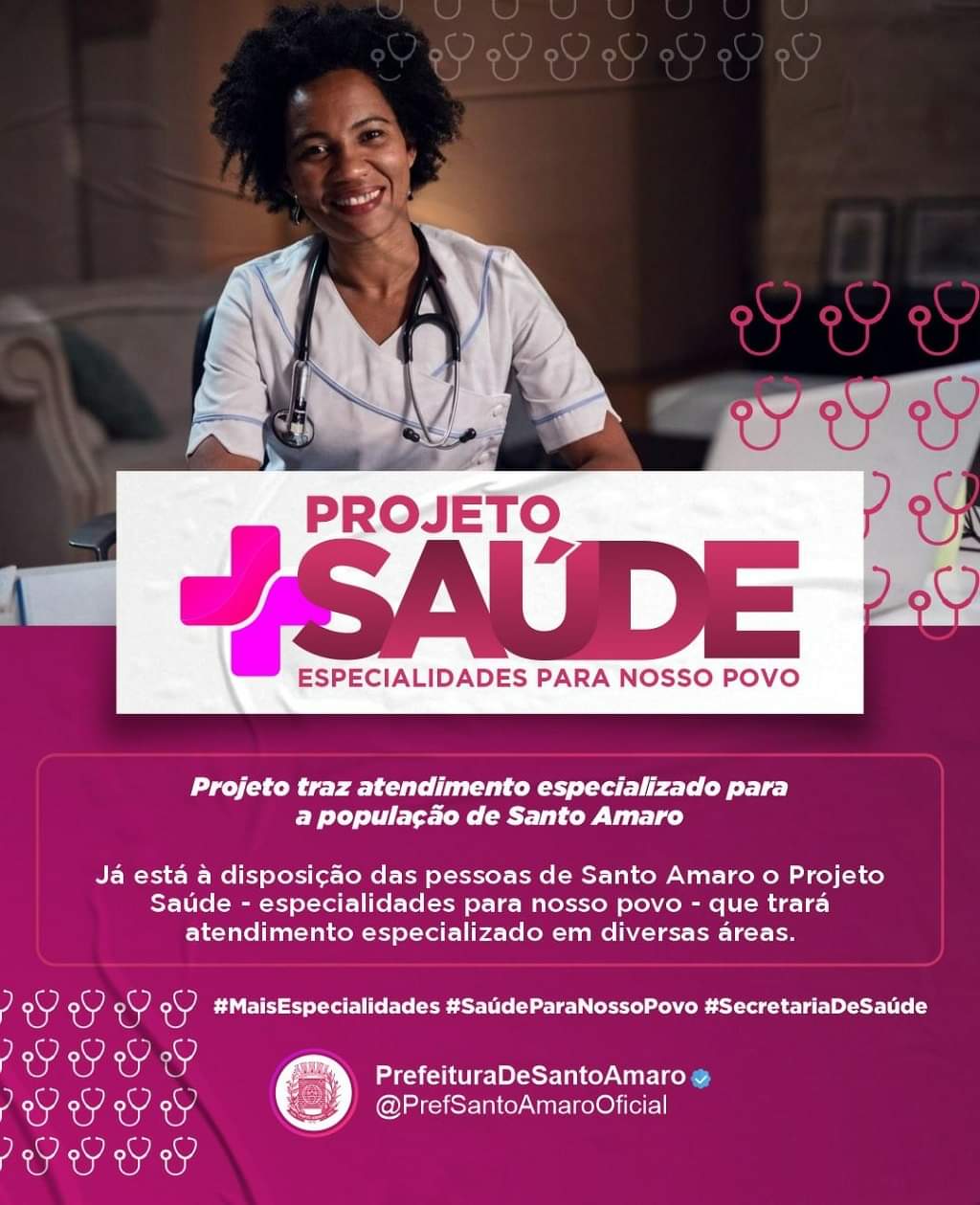 Já está à disposição das pessoas de Santo Amaro o Projeto Saúde – especialidades para nosso povo – que trará atendimento especializado em diversas áreas.