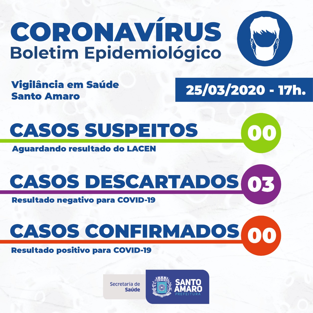 A Secretaria de Saúde do Município de Santo Amaro informa que o Laboratório Central (Lacem), divulgou nesta quarta (25), o resultado dos exames de pacientes com caso suspeito para o COVID-19. Todos os resultados atestaram NEGATIVO.