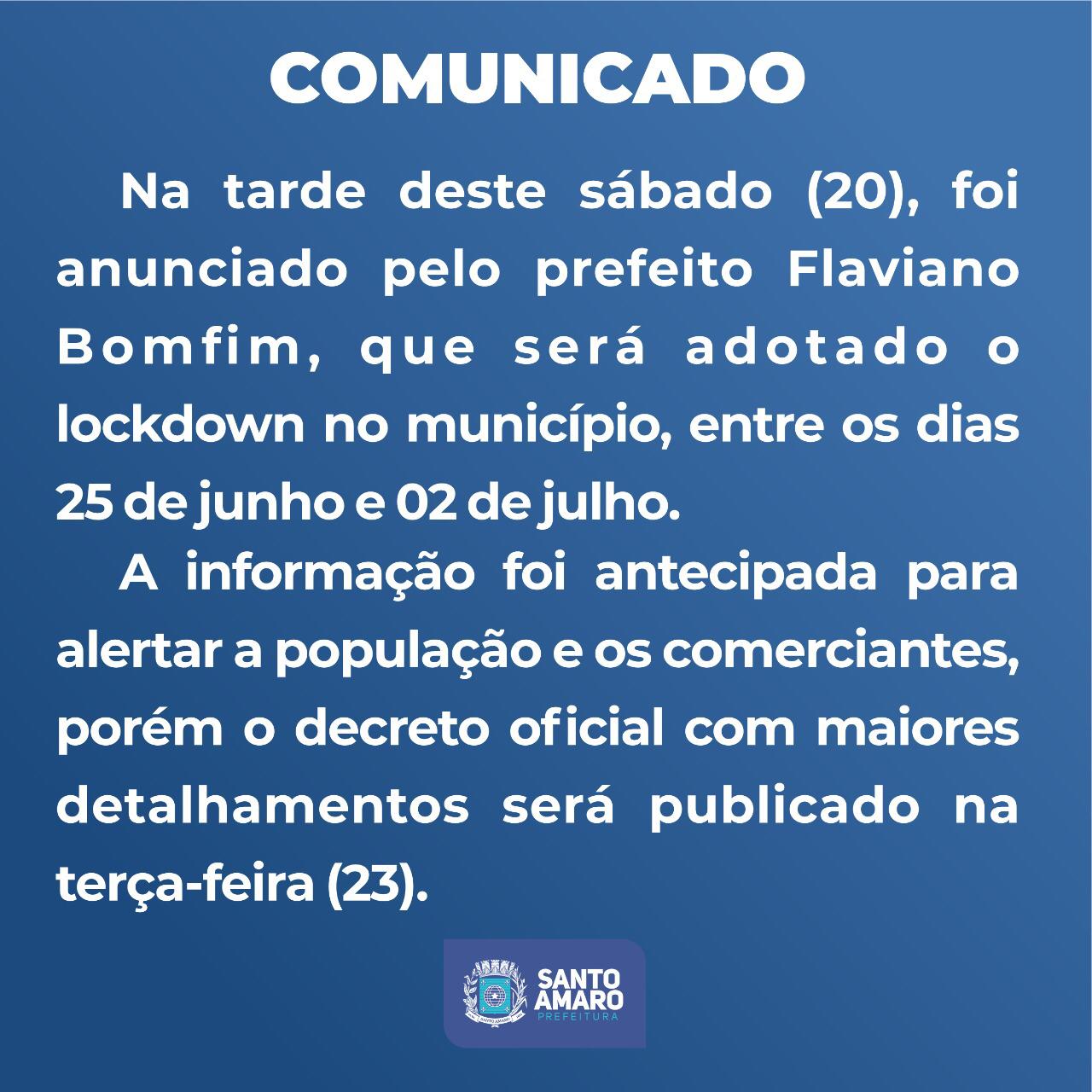 Na tarde deste sábado (20), foi anunciado pelo prefeito Flaviano Bomfim, que será adotado o lockdown no município, entre os dias 25 de junho e 02 de julho. A informação foi antecipada para alertar a população e os comerciantes, porém o decreto oficial com maiores detalhamentos será publicado na terça-feira (23).