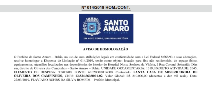 O prefeito de Santo Amaro, Flaviano Bomfim (DEM), publicou no diário oficial dessa segunda-feira (27) a homologação da dispensa de licitação para contratar as dependências da Santa Casa de Misericórdia do distrito de Oliveira dos Campinhos. A prefeitura vai pagar o montante de R$210.000,00, num período de 21 meses, para locar a estrutura interna da Santa Casa, além de todos os utensílios e equipamentos da unidade de saúde. Recentemente a Santa Casa foi reaberta em acordo com o provedor da unidade que não tem apoio da maioria da mesa diretora.