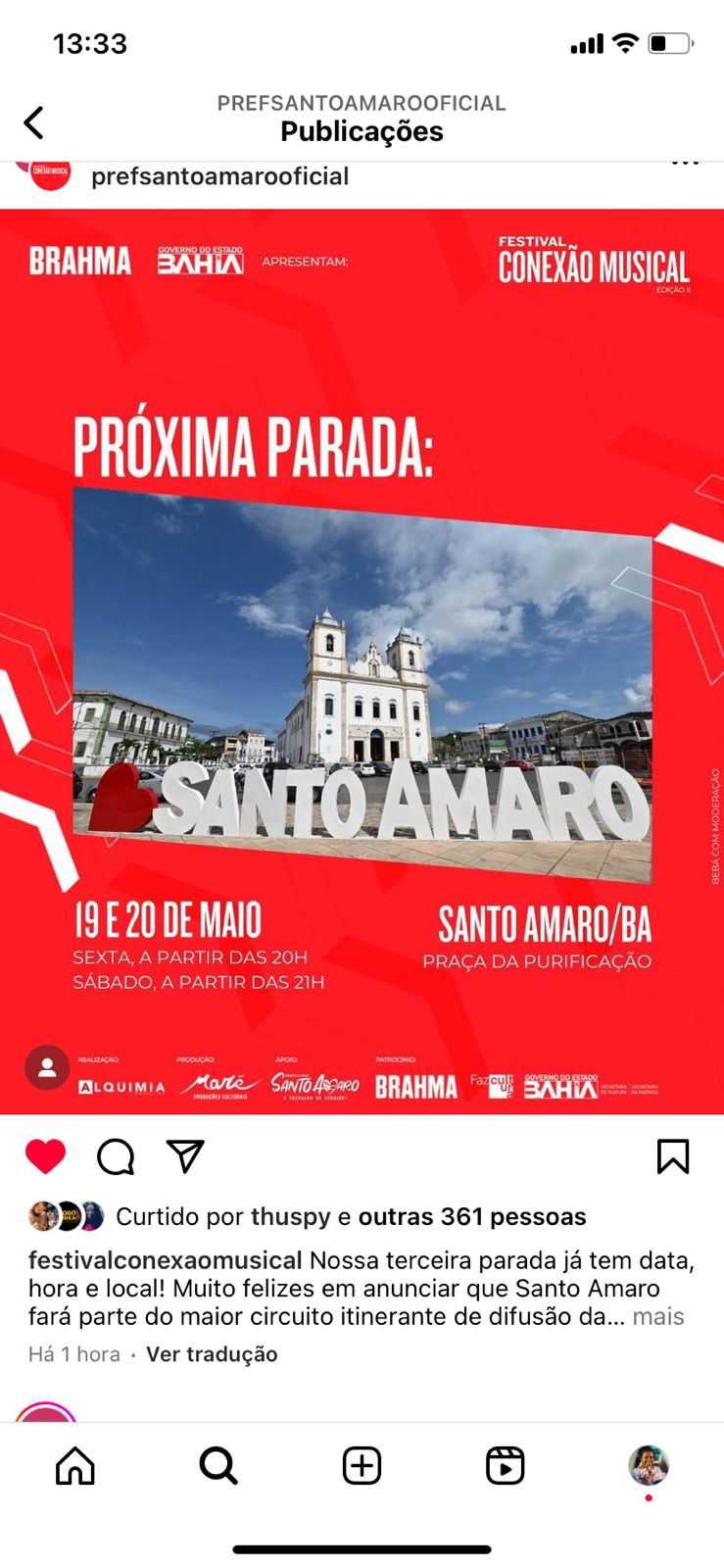 Santo Amaro da Purificação recebe o palco itinerário do Festival Conexão Musical edição ll, nos dias 19 e 20 de maio (sexta e sábado), na Praça da Purificação. O evento conta com atrações como Sambaiana e Samba Chula João do Boi no dia 19, e no dia 20 quem agita a multidão é Cicinho de Assis e Léo o Novo Som.