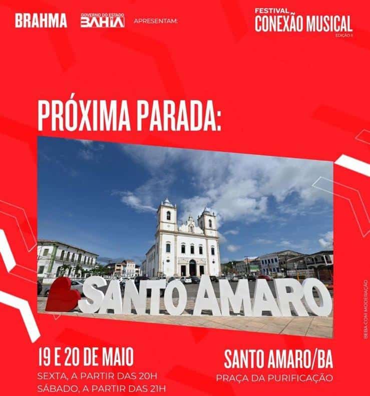 Santo Amaro da Purificação recebe o palco itinerário do Festival Conexão Musical edição ll, nos dias 19 e 20 de maio (sexta e sábado), na Praça da Purificação. O evento conta com atrações como Sambaiana e Samba Chula João do Boi no dia 19, e no dia 20 quem agita a multidão é Cicinho de Assis e Léo o Novo Som.