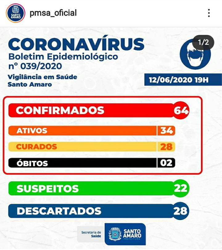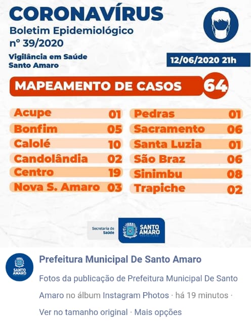 A Secretaria de Saúde de Santo Amaro informa os novos dados adicionados ao Boletim Epidemiológico desta sexta-feira (12) e retifica o card com o mapeamento de casos: