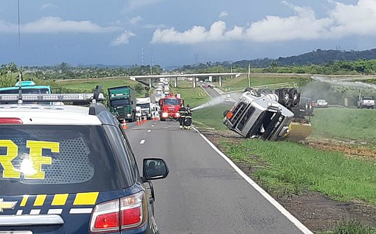 Também atuam na ocorrência o Corpo de Bombeiros, a Polícia Rodoviária Federal (PRF) e a empresa responsável pela proteção ambiental e transbordo da carga.