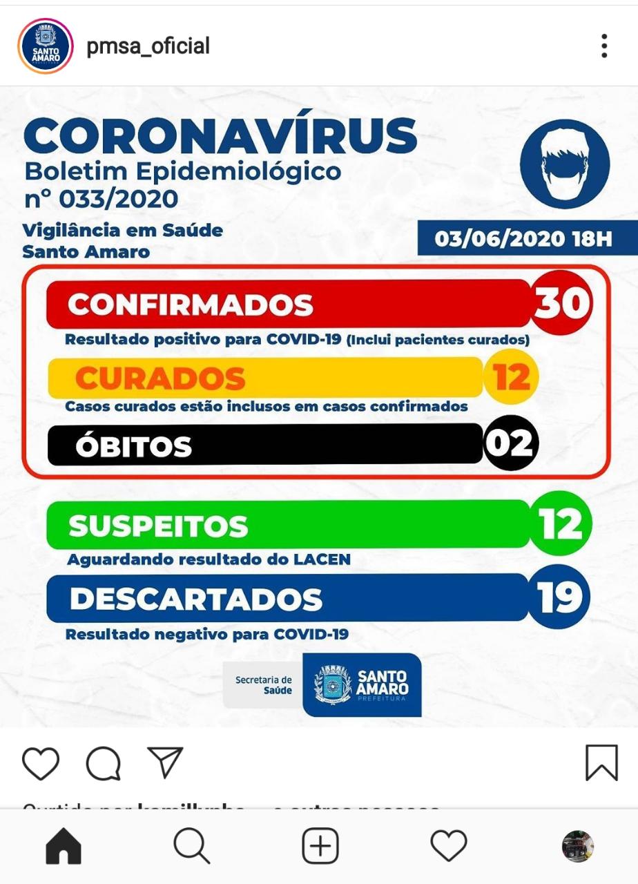 A Secretaria de Saúde de Santo Amaro informa os novos dados adicionados ao Boletim Epidemiológico desta quarta-feira (03): – Três (03) pacientes receberam resultado positivo para a Covid-19, através de análise do Laboratório Central de Saúde Pública do Estado (LACEN). – Mais seis (06) pacientes estão curados. – Foram realizadas três (03) coletas para análise do LACEN. Os novos casos foram notificados como suspeitos. – Dois (02) pacientes receberam resultado negativo para a Covid-19 após análise do LACEN.