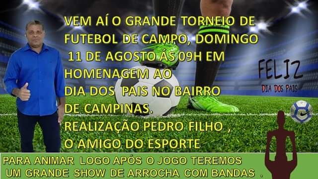 Esporte é saúde esporte e ação no próximo dia 11 de Agosto a partir das 9 horas da manhã será realizado no campo de Campinas município de São Francisco do Conde um grande torneio de futebol em homenagem ao Dia dos Pais uma realização do nosso amigo Pedro Filho sempre preocupado em fomentar e apoiar o futebol do bairro de Campinas e logo após. Otorneio de futebol será realizado, uma grande festa em homenagem ao Dia dos Pais com apresentação de diversas atrações musicais. Então no próximo dia 11 de Agosto todos convidados para participar desta grande festa em homenagem ao Dia dos Pais no Campo de Campinas município de São Francisco do Conde.