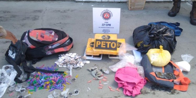 Com ele os PMs apreenderam cinco tabletes de cocaína, 213 porções prontas da mesma droga, 12 papelotes com maconha e oito mil pinos vazios que seriam utilizados para comercializar cocaína.