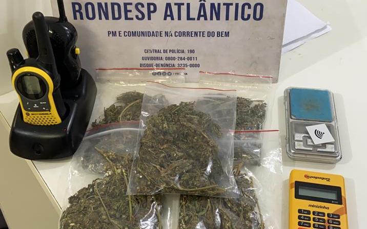 No apartamento, após consentimento da mãe do traficante, foram apreendidos cinco porções grandes de maconha, uma balança, dois rádios comunicadores, uma máquina de cartão, um celular e embalagens plásticas. O caso foi registrado na Central de Flagrantes.