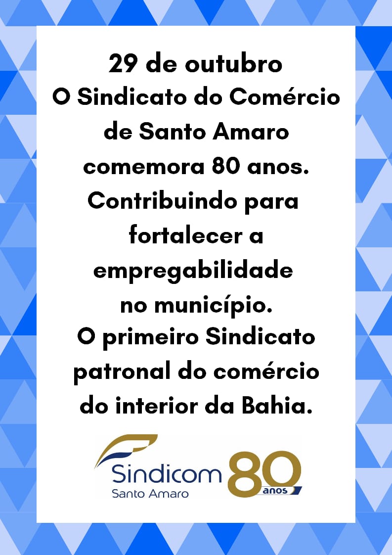 Naquela noite memorável nascia a Associação do Comércio do município de Santo Amaro que após cinco anos, em 1944, o nome da entidade foi alterado para Sindicato do Comércio Varejista de Bens e Serviços de Santo Amaro.